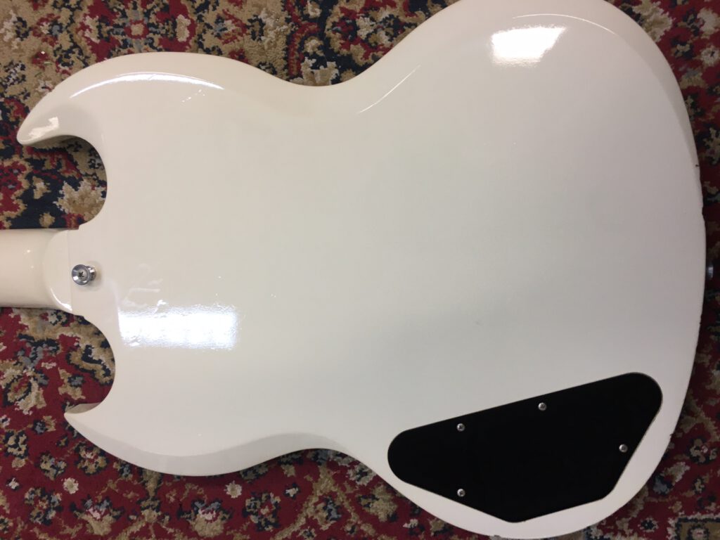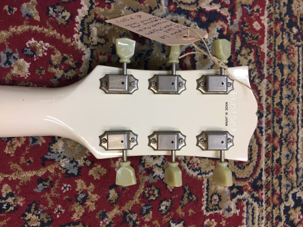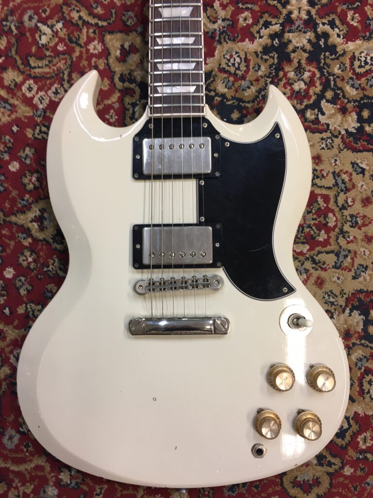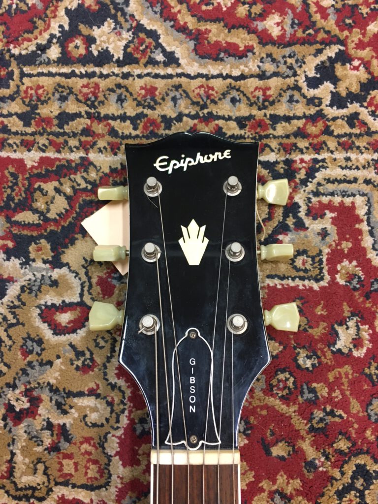 Epiphone versie van de Gibson SG. Gemaakt in de Fujigen fabriek in Japan. Speciale serie met extra dunne lak. Bijzonder resonante en lichte gitaar. 1 inlay vervangen en 4 niet originele knoppen, verder origineel met Epiphone tas.