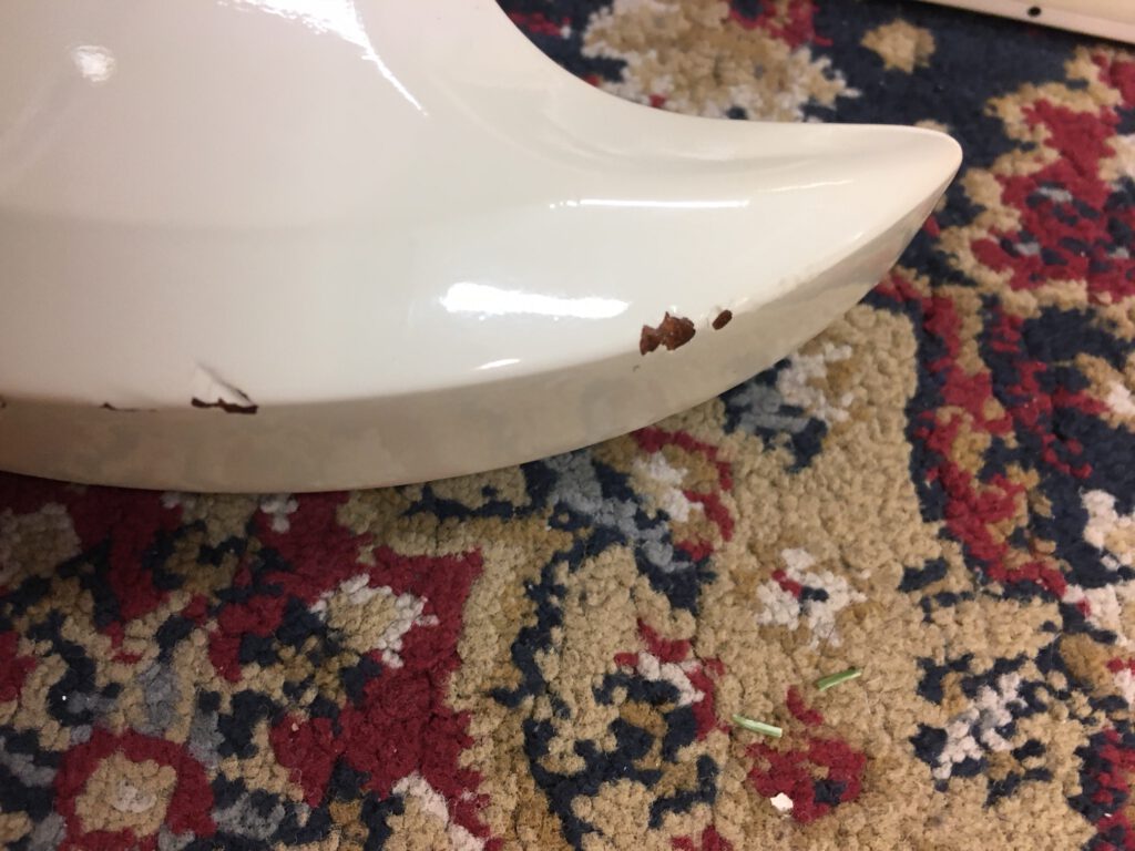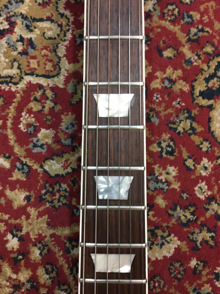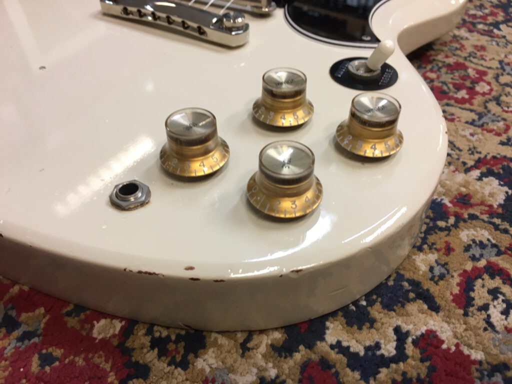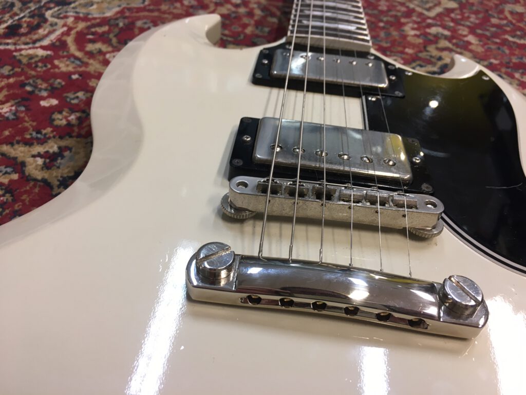 Epiphone versie van de Gibson SG. Gemaakt in de Fujigen fabriek in Japan. Speciale serie met extra dunne lak. Bijzonder resonante en lichte gitaar. 1 inlay vervangen en 4 niet originele knoppen, verder origineel met Epiphone tas.